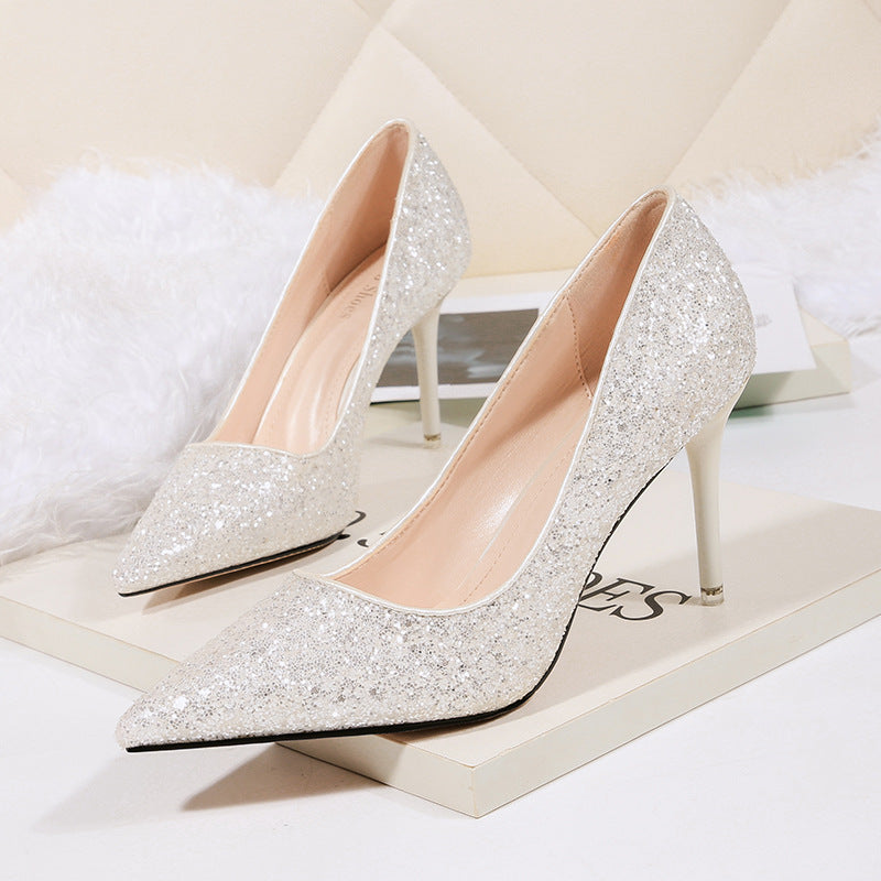 2022 New Stiletto Pumps Cinderella Dress Banquet Bling Wedding Shoes Silver Gold Pointed High Heels Female Bride Wedding Shoes
