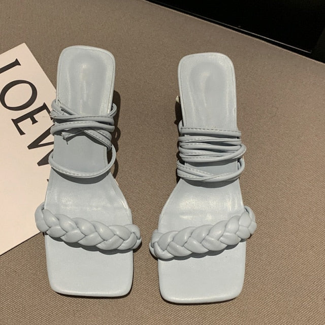 SUOJIALUN New Fashion Women Weave Sandals Square High Heel Lace Up Gladiator Shoes Narrow Band Back Strap Sandal Zapatos Mujer